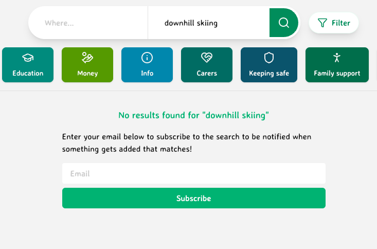 Sometimes users cannot find what they need in the directory and this can be because the item has not yet been added. The BETA site has a feature whereby an empty search will show a form allowing the user to log their search and their email address. The system will periodically retry this search and if items are returned the user will be sent an email with a link to them